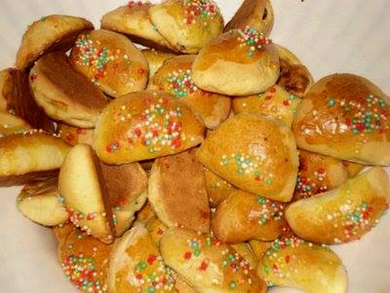 Il giorno dopo si prepara la pasta frolla con farina, zucchero, uova, olio extravergine d’oliva, lievito e aroma di vaniglia. Si stende la pasta sottile e si tagliano dei dischetti di 10 cm di diametro. Si mette una pallina di ripieno al centro di ogni dischetto e si chiude a mezzaluna. Si spennellano i biscotti con dell’uovo sbattuto e si decorano con delle codette di zucchero colorate. Si infornano a 180 gradi per 15 minuti circa.
