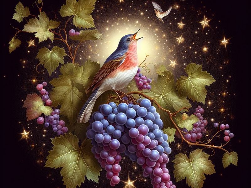 Un usignolo che ogni sera cercava riparo tra le sue foglie sentì i suoi singhiozzi e le disse: “Non piangere questa sera tutti conosceranno il tuo dolore e la tua storia”. Al calar della sera l’usignolo si mise infatti sui miseri resti dei rami della vite e con il suo canto melodioso ne raccontò la storia. E così per dieci notti. Alla decima notte il suo canto arrivò fino il cielo e fu sentito dalle stelle che si commossero e si affacciarono per vedere la pianta straziata e il suo amico usignolo che ne cantava il dolore. Le lacrime delle stelle giunsero sulla vite che si sentì fremere allora da una nuova vita. I suoi rami si gonfiarono e spuntarono dei pampini e viticci che avvolsero teneramente l’usignolo. Le lacrime si trasformarono in piccoli succosi frutti che pendevano dai rami a grappoli.