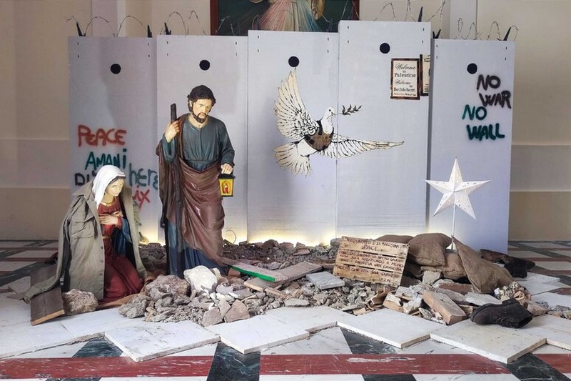 Accanto al presepe, una grata in legno riporta un passo della Lettera di Paolo agli Efesini: “Egli, infatti, è la nostra pace colui che di due ha fatto una cosa sola, abbattendo il muro di separazione che li divideva, cioè l’inimicizia, per mezzo della sua carne”. Sull’altro lato, invece, si legge “Welcome to Palestine. Welcome to Bethlehem”, con il riferimento al conflitto israelo-palestinese e al luogo di nascita di Gesù.