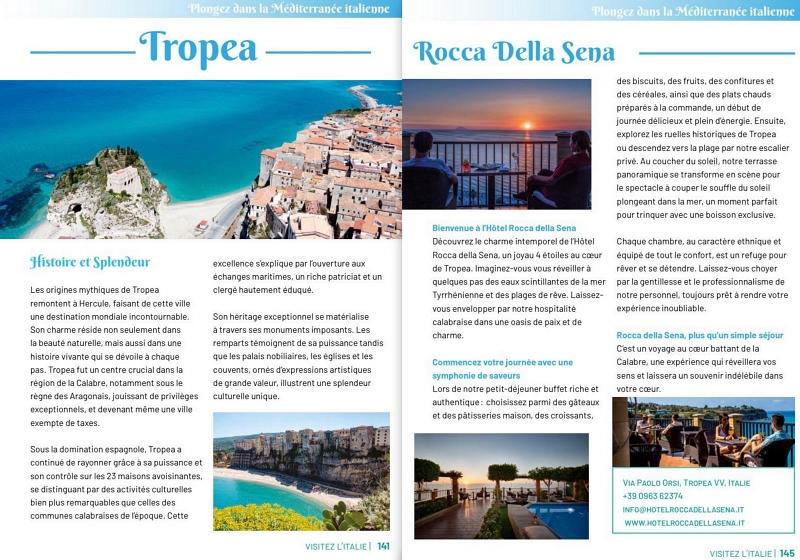 Più pagine, più foto, un box ad hoc intitolato Marchio di qualità (con l’elenco di tutti i riconoscimenti conquistati), più proposte e complessivamente maggiori riconoscibilità e visibilità della nostra destinazione su VISITEZ L’ITALIE, il prestigioso e qualificato strumento di promozione turistico-esperienziale realizzato dalla Camera di Commercio Italiana a Nizza attraverso il Progetto 10 Comuni al quale Tropea ha rinnovato l’adesione.