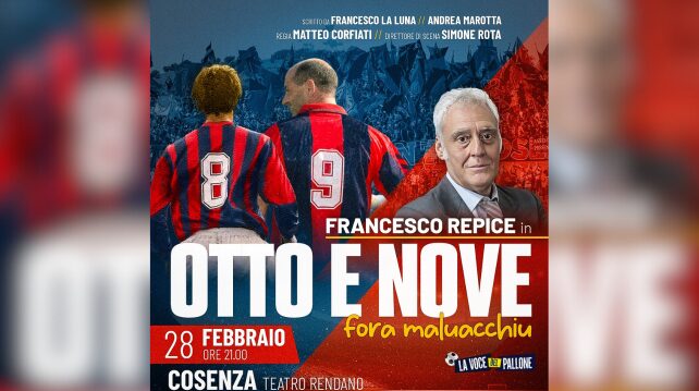 Dopo quasi trent’anni di radiocronache che hanno emozionato intere generazioni, Repice porta in scena nella sua città natale uno spettacolo dedicato alla storia popolare del calcio: OTTO E NOVE (fora maluacchiu). Una data unica, mercoledì 28 febbraio alle 21.00 al teatro Rendano. I biglietti sono già disponibili nei punti vendita Inprimafila in città, sul portale www.inprimafila.net al link https://www.inprimafila.net/index.php/eventi/otto-e-nove-cosenza e su www.ticketone.it al link https://www.ticketone.it/eventseries/otto-e-nove-3582926/