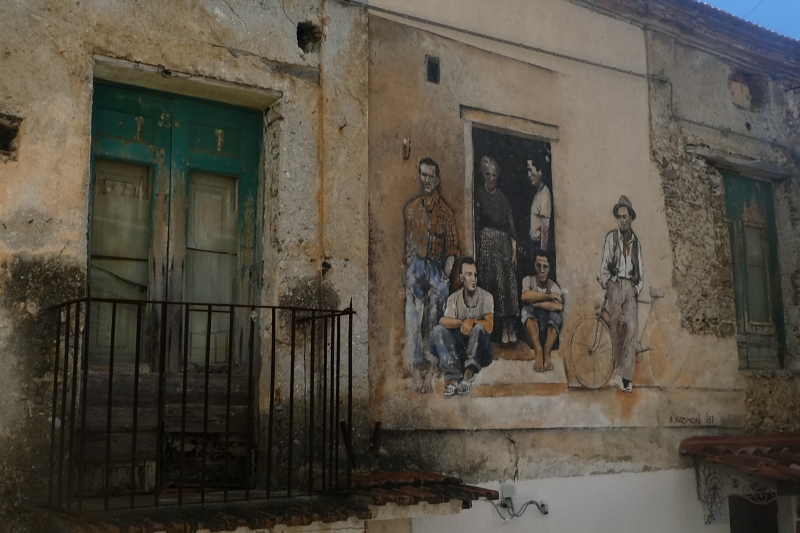 Il murale è la raffigurazione dell’immagine scattata dal fotografo americano Paul Strand a Luzzara (RE) che fa da copertina al fotolibro “Un Paese” realizzato insieme allo sceneggiatore e giornalista Cesare Zavattini. La foto raffigura cinque uomini e una donna, sulla soglia di una casa, nell’immobile attesa di una ripartenza nell’Italia dell’immediato dopoguerra. Kadmon ha rivisto nel borgo di pescatori che era Diamante nel 1981, le stesse condizioni del borgo contadino di Luzzara decidendo di riprodurre la foto di Paul Strand sui muri del borgo calabrese.