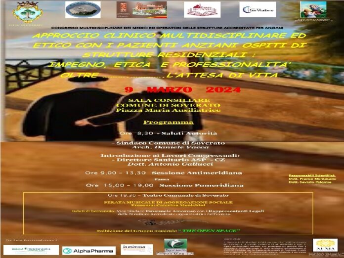 “Approccio clinico multidisciplinare ed etico con i pazienti anziani ospiti di strutture residenziali. Impegno, etica e professionalità oltre l’attesa della vita”. È questo il titolo dell’importante congresso, organizzato dal provider Xenia di Francesca Mazza, che avrà luogo a Soverato sabato prossimo. Il 9 marzo, dunque, nella sala consiliare in piazza Maria Ausiliatrice, i responsabili scientifici, i dottori Franco Montesano e Saverio Palermo, discuteranno, con i colleghi e gli addetti ai lavori, delle strutture residenziali accreditate per l’ospitalità di utenti anziani, nelle quali operano professionisti medici, oltre che di altre discipline multiprofessionali.