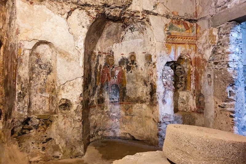 La chiesa di San Nicola è un piccolo gioiello. A navata unica con abside, l’edificio conserva pregevoli affreschi bizantini, antiche iscrizioni in greco e latino e un’antica macina in pietra (in epoca più recente venne trasformata in frantoio).