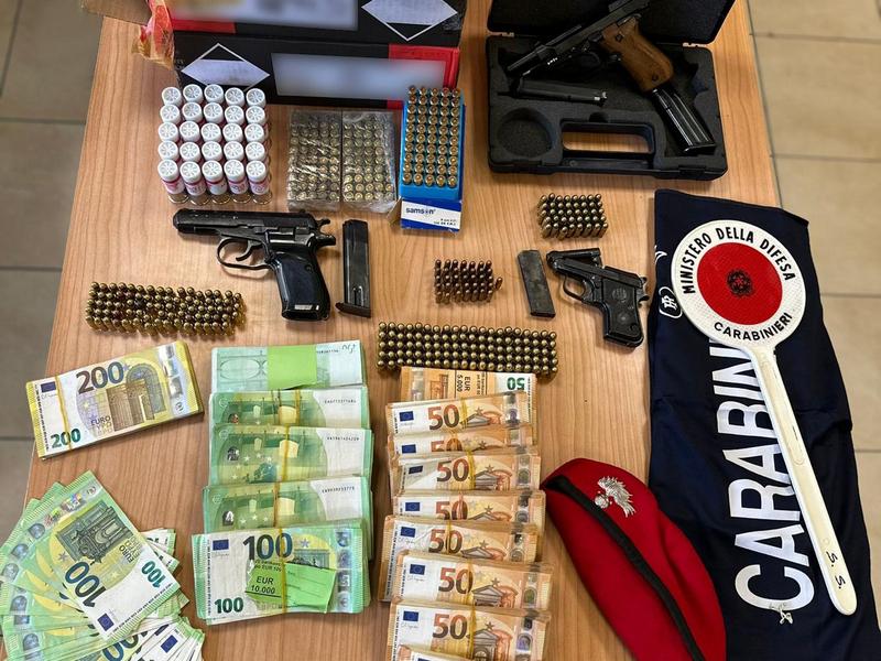 I militari dell’Arma, insospettiti da questi atteggiamenti assunti pubblicamente, hanno dunque proceduto al controllo, sequestrando rispettivamente presso l’abitazione dell’uomo e presso la sua proprietà rurale, una pistola semiautomatica cal. 6,35 con colpo in canna, una pistola semiautomatica cal. 9 con matricola abrasa, una pistola semiautomatica cal 7,65 con matricola parzialmente abrasa comprensiva di due caricatori e valigetta, oltre 110 mila euro, 500 cartucce cal. 12, 50 cartucce cal. 9×21, 118 cartucce cal. 7,65, 36 cartucce cal. 6.35, 200 cartucce 380.