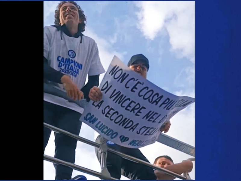 In foto copertina, in bella mostra, da sopra il pullman dei campioni d’Italia, sventolava anche il cartellone di “San Lucido”.
