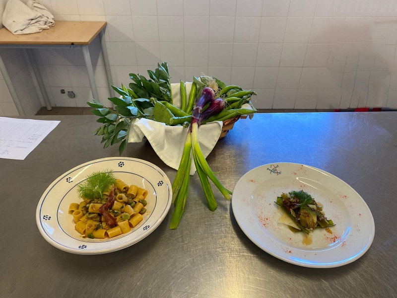 Dal carpaccio di corteccia di fave dell’azienda agricola della Scuola, con glassa di Cipolla Rossa di Tropea caramellata e scaglie di Pecorino Crotonese Biologico Dop; alla zuppa di fagioli dell’altopiano silano, accompagnati da cicoria coltivata nell’azienda agricola del Majorana, da cotiche di maiale, costoni di pane (realizzato con farina semi-integrale bio dell’Istituto Tecnico Agrario) e cime di rapa; dalle uova con piselli e salsiccia, tra gli insaccati trasformati dagli stessi studenti nelle ore di cucina; passando dai perciatelli con cime di capperi, anch’essi di produzione locale; fino agli occhi di lupo, con fave, cipolla rossa di Tropea e croccantino di pancetta.