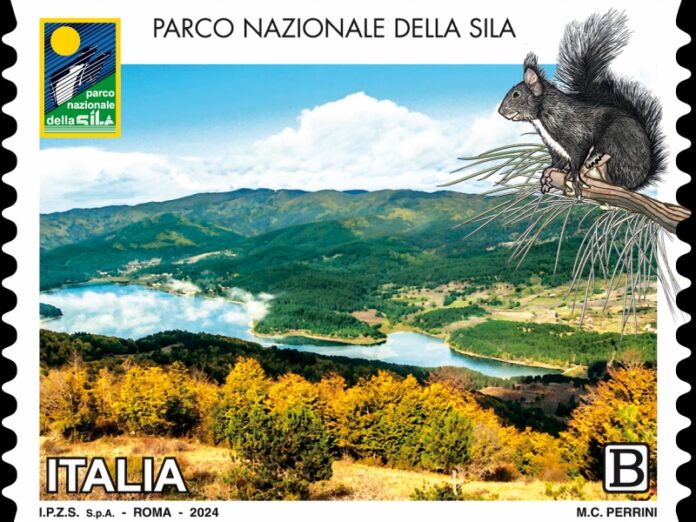 la vignetta raffigura una veduta del Parco Nazionale della Sila in cui si evidenzia, in alto a destra, lo scoiattolo nero meridionale, un piccolo roditore la cui diffusione è circoscritta alla zona del Pollino, della Sila e dell’Aspromonte. In alto a sinistra, è riprodotto il logo del Parco Nazionale della Sila.