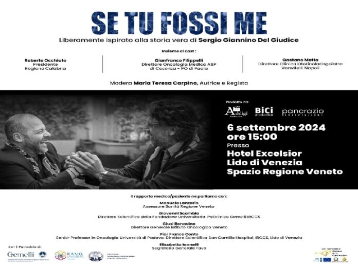 Durante il dibattito, che sarà animato da Manuela Lanzarin, Assessore alla Sanità della Regione veneta, da Giovanni Scambia, Direttore scientifico della Fondazione Universitaria Policlinico Gemelli IRCCS, da Giusy Bonavina, Direttore Generale Istituto Oncologico Veneto, da Pier Franco Conte, Senior Professor in Oncologia all’Università di Padova e Direttore Scientifico del San Camillo Hospital, IRCCS Lido di Venezia, infine da Elisabetta Iannelli, Segretario Generale Favo, dicevo durante il dibattito saranno proiettati trenta minuti del film SE TU FOSSI ME, sorgente delle sicure quanto acute osservazioni degli astanti.