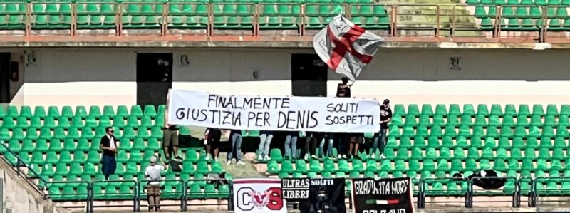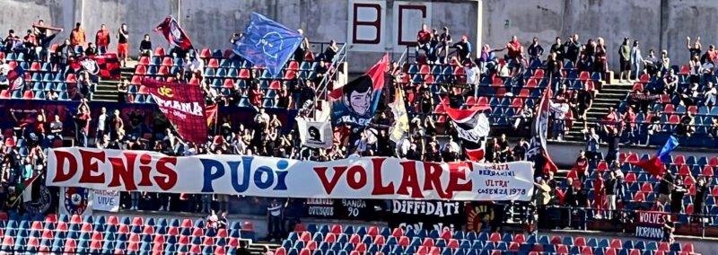 “Giustizia per Denis” – “Denis puoi volare”! L’accoglienza del “S.Vito/Marulla” di Cosenza non poteva che essere dedicata a Denis Bergamini dopo la storica sentenza di martedì scorso che ha visto la condanna a 16 anni di reclusione per Isabella Internò, l’ex compagna di Bergamini. Anche i tifosi del Sudtirol hanno preso parte all’iniziativa lanciata dalle due curve rossoblù esponendo all’ottavo minuto di gioco uno striscione in memoria di Denis.
