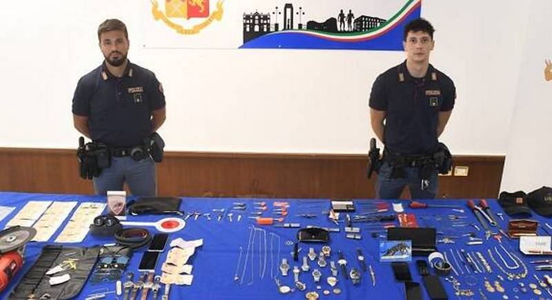 Ad esito della perquisizione, gli Agenti della Polizia di Stato hanno rinvenuto, in ogni stanza dell’appartamento, una consistente quantità di oggetti atti allo scasso, come chiavi “bumping” per l’apertura di porte blindate, grimaldelli, carte sagomate per il rilevamento delle impronte digitali, pinze, cacciaviti ed un flex, nonché un’ingente quantità di monili in oro e argento, gioielli e orologi di valore, banconote di vario taglio per un totale di 1800 euro, nonché 7 telefoni cellulari con diverse sim di telefonia mobile.