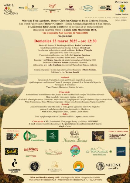 Domenica 23 marzo alle ore 12:30 nei locali del Casale della Misericordia 1850, Via Cinquanta, San Giorgio di Piano (BO), la Wine and Food Academy, Calabria Gourmet, l’Accademia della Cucina Calabrese e il Rotary Club San Giorgio di Piano Giulietta Masina celebrano la cucina calabrese