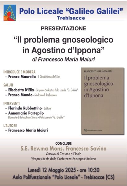 Sarà presentato domani, 12 maggio alle 10:30, presso l’ Aula Polifunzionale del Polo Liceale Galileo Galilei di Trebisacce, il libro “Il problema gnoseologico in Agostino di Ippona”, scritto da Francesco Maria Maiuri.