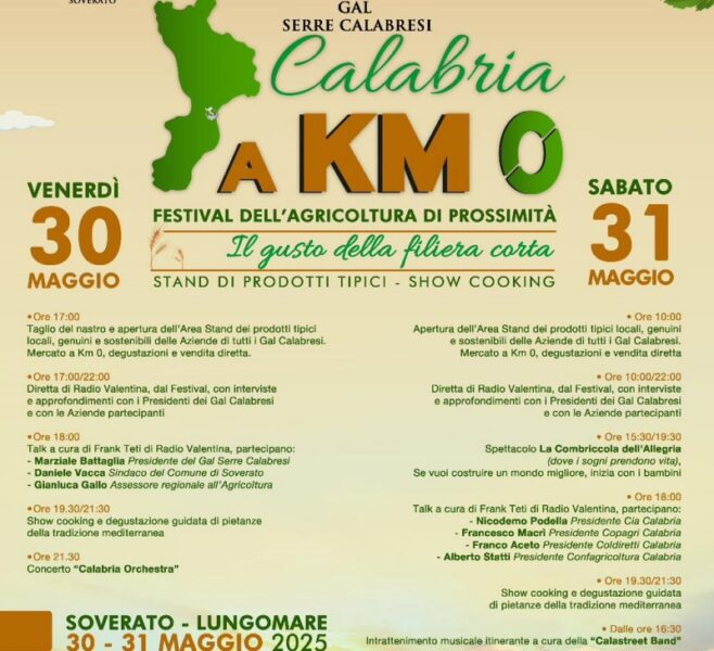 Soverato si prepara ad accogliere “Calabria a Km 0”, il festival dell’Agricoltura di prossimità, un appuntamento imperdibile per gli amanti dei prodotti genuini, sostenibili e a filiera corta. L’evento, organizzato dal Gal “Serre Calabresi” in collaborazione con il Comune di Soverato e con la partecipazione di tutti i Gal della Calabria, si terrà sul Lungomare venerdì 30 e sabato 31 maggio.