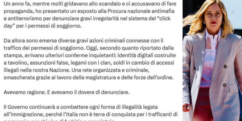 Lo scrive sui social la premier Giorgia Meloni. «Avevamo ragione. E avevamo il dovere di denunciare. Il Governo continuerà a combattere ogni forma di illegalità legata all’immigrazione, perché l’Italia non è terra di conquista per i trafficanti di permessi e per chi vive di furbizie e scorciatoie. Avanti, senza paura».