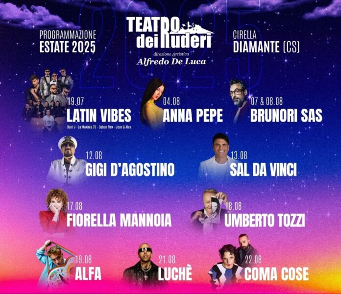 Il calendario 2025 si arricchisce di grandi nomi del panorama musicale italiano e internazionale, con presenze già confermate come Alfa, Luchè, Anna Pepe, Gigi D’Agostino, Fiorella Mannoia, Sal Da Vinci, Coma Cose, l’appuntamento internazionale Latin Vibes dedicato al mondo latino e l’intramontabile Umberto Tozzi.