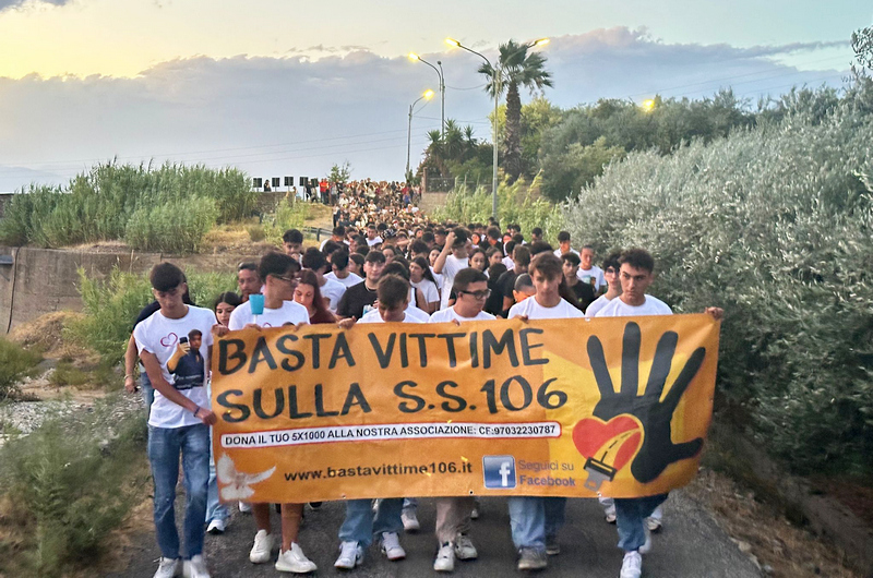 Più di un migliaio di persone, tra cui tantissimi giovani amici di Gaetano, hanno preso parte all’iniziativa promossa dall’Organizzazione di Volontariato “Basta Vittime Sulla Strada Statale 106”, per onorare la sua memoria e ribadire, ancora una volta, l’urgenza di interventi strutturali sulla tristemente nota “strada della morte”.