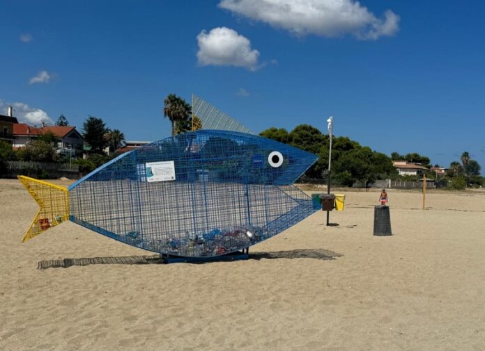 L’installazione, realizzata in collaborazione con la ditta Muraca, porta lo slogan “Riempiamo questo pesce, non quelli in mare” e mira a coinvolgere cittadini e turisti in un’azione concreta contro l’abbandono dei rifiuti, in particolare sulle spiagge.