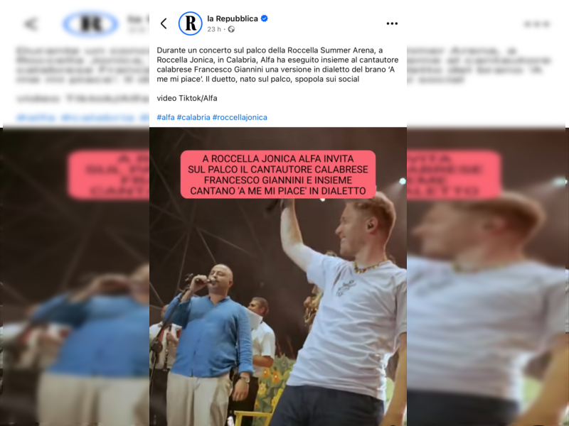 Il brano “A me mi piace” in versione calabrese, frutto del sorprendente duetto tra Francesco Giannini e Alfa, sta letteralmente spopolando sul web e travolgendo i media nazionali e regionali. Il video della performance, registrato live durante il concerto del 20 agosto alla Roccella Summer Arena, è diventato virale in poche ore, attirando l’attenzione della stampa e delle radio più seguite del Paese.
