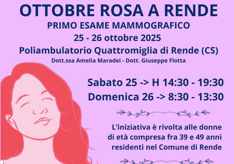 Il Comune di Rende si unisce con grande entusiasmo alle iniziative nazionali per l’Ottobre Rosa, il mese internazionale dedicato alla sensibilizzazione sulla prevenzione e la cura del tumore al seno. L’Amministrazione Comunale, in collaborazione con AIRC e diverse associazioni e professionisti del settore sanitario, celebra già un risultato straordinario: tutte le prestazioni di screening ecografico e mammografico gratuito previste per il weekend del 25 e 26 ottobre 2025 sono state interamente prenotate.