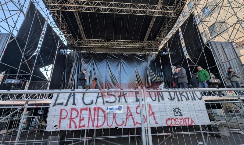 I membri del Comitato Prendo Casa hanno occupato il palco allestito in Piazza dei Bruzi, destinato a ospitare il concerto di Dario Brunori, per accendere i riflettori sul dramma dell’emergenza abitativa che colpisce migliaia di famiglie in città.