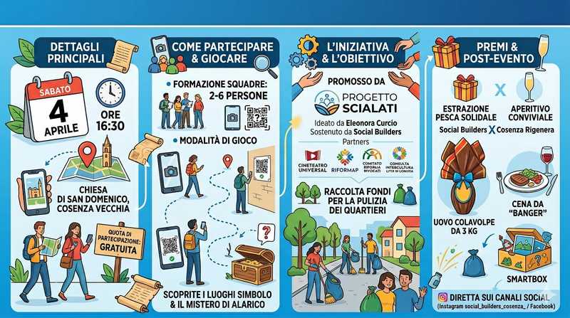 Oltre alla componente ludica, la giornata assume una rilevanza sociale legata alla cura dell’ambiente urbano. Al termine della caccia al tesoro si terrà infatti l’estrazione della pesca solidale denominata “Social Builders X Cosenza Rigenera”. I fondi raccolti tramite questa attività saranno interamente devoluti alla pulizia di alcuni quartieri della città, traducendo lo spirito dell’evento in un beneficio concreto per la collettività.